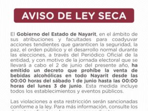 El ejecutivo estatal, en el ejercicio de sus atribuciones para apoyar acciones que aseguren la seguridad, el orden público y el desarrollo normal durante las elecciones, ha emitido un decreto a para la jornada electoral del 2 de junio de este año, que prohíbe de la venta de bebidas alcohólicas en todo el territorio de Nayarit, desde las 00:00 horas del sábado 1 de junio hasta las 00:00 horas del lunes 3 de junio. Esta restricción aplica a todos los establecimientos y eventos públicos. Las violaciones a esta medida serán sancionadas de acuerdo con la ley. Para más detalles, consulte los decretos oficiales y las leyes pertinentes.